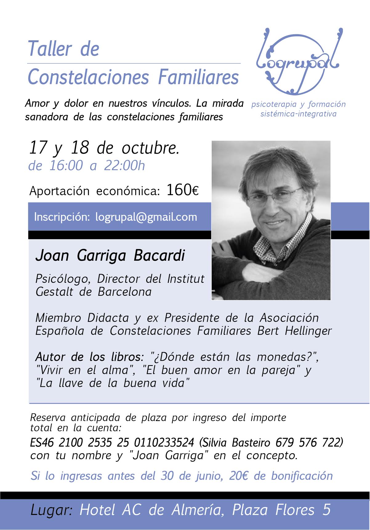 Los días 17 y 18 de octubre”logrupal” vuelve a contar con Joan Garriga para compartir un taller que no puedes dejar pasar, “Amor y dolor en nuestros vínculos. La mirada sanadora de las Constelaciones familiares”.. ¡RESERVA TU PLAZA YA!
